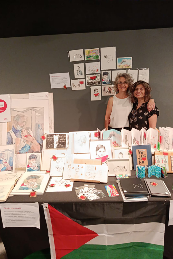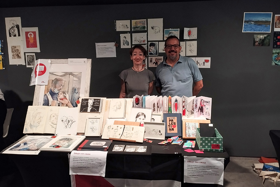 La feria contó con numerosos stands llenos de creatividad, entre los que destacó la participación de la Escuela de Arte de Zaragoza, con un espacio expositivo repleto de obras del alumnado y del profesorado. Ambas muestras unieron fuerzas en una causa solidaria: destinar la recaudación de las ventas a la ayuda humanitaria en Palestina, a través de Médicos Sin Fronteras.